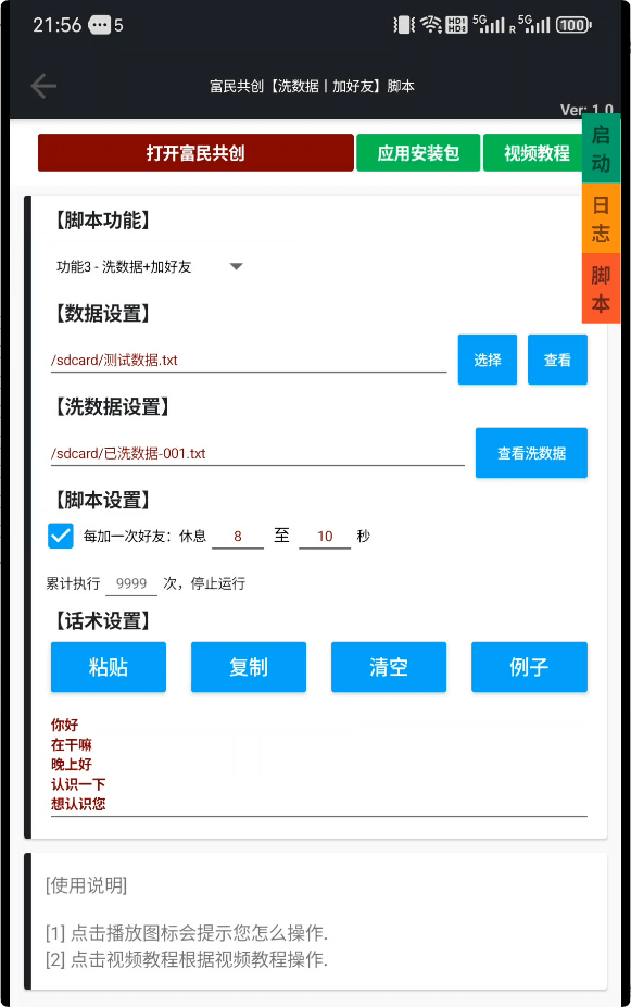 ## 更新日志 -- v1 ** 新增自动洗数据功能 ** 优化洗数据功能独立 ** 优化加好友功能独立 ** 自动导入数据 ** 自动搜索数据 ** 自动加数据好友 !! 如需定制脚本, 请联系客服