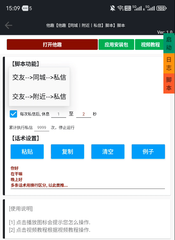 ## 更新日志 -- v1 ** 支持同城私信 ** 支持附近私信 ** 支持过滤重复 ** 支持私信任务 !! 如需定制脚本, 请联系客服 PS: 在[木叔脚本APP]中搜索[215]即可找到该脚本