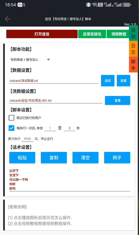 - 脚本就是通过安装手机APP应用,在相应的应用里给里面的人发广告,通过发消息,将人到我们的微信或QQ当中。 现在QQ或微信加人限制越来越大,封号几率成倍增加。现在通过脚本,来实现被动加人,就降低了封号风险。 脚本设置非常简单,利用平台APP内的私信和关注等功能自动化操作,发消息给APP内的用户,通过话术到自己的QQ或微信里,实现了被动加人。 有人问,用脚本一天能加到多少人?我只能说你干的多,就的多。举个例子,开一个模拟器运行一天脚本如引到50+人,那么多开模拟器去操作,就可以相当可观的人数。